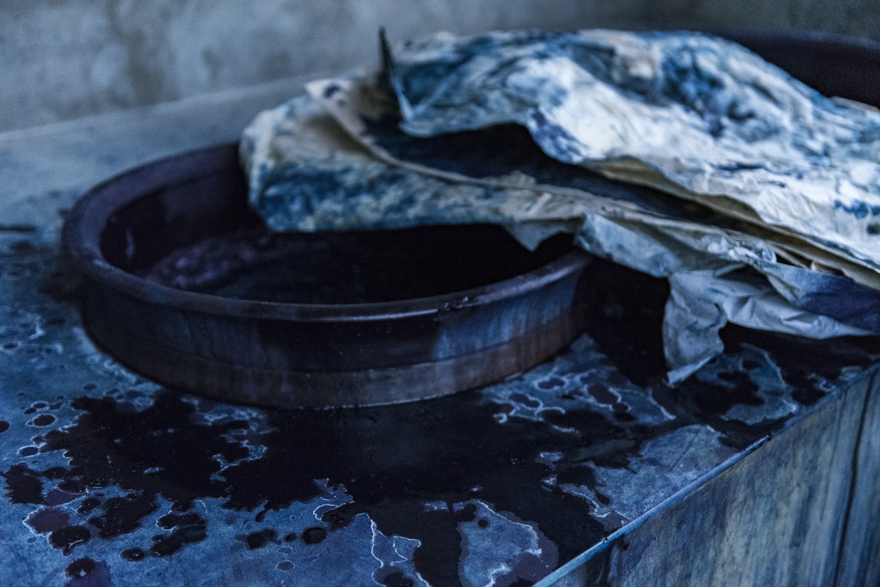 企業として新規参入するなら、場所にこだわらず、空港に近い場所で、Wi-fiが整っていればできるのではないか? ただし、染めの作業をするには、排水の問題をクリアにしなければなりません。というのも、藍染めには、布を染めるために使った水を処理する排水マス(22〜23tのプール)が不可欠だからです。そのためには、近隣住人の理解も必要。それならば、自分のことをよく知る人がたくさんいる生まれ育った故郷で起業するのが一番だと、思い当たったのでした。