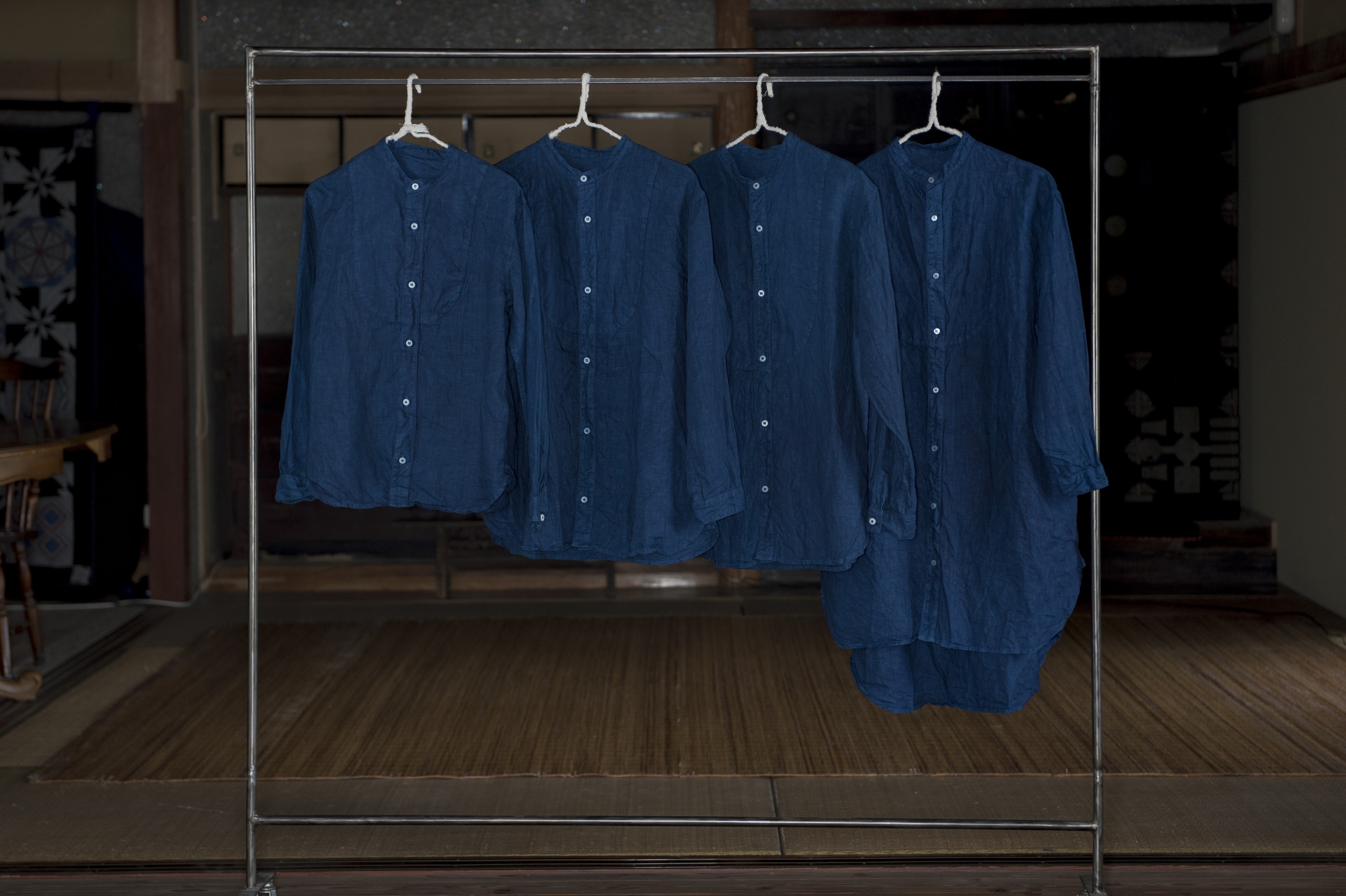 カラーは藍染めのブルー系をはじめ、青からグレーへのグラデーションが並ぶようなニュアンスある展開。生地作りと縫製のみ国内の信頼できる会社に依頼し、それ以外は天然染料を使って職人が手染めし、全て自社で作り上げているのです。一言で「青」といっても、こんなにたくさんの色があるのかと、そのバリエーションの繊細さにため息が出るほど。