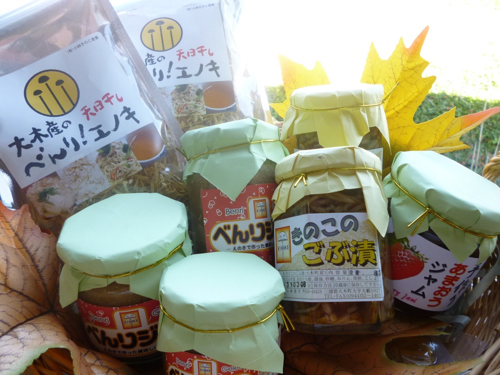 大木町の特産といえば「きのこ」が有名ですが、「小林きのこ産業」は、50年近く前に社長の小林さん夫妻が、一からスタートさせた事業でした。同社が生産するきのこの半分は地元筑後エリアのスーパーや道の駅等に出荷され、好評を博しています。また、平成17年からエノキ加工品も多数開発し、「もっと美味しくエノキを食べてもらいたい」との思いから、エノキの食べ方も様々に提案。毎日料理を作る女性目線に立った、ユニークなラインナップから目が離せません。