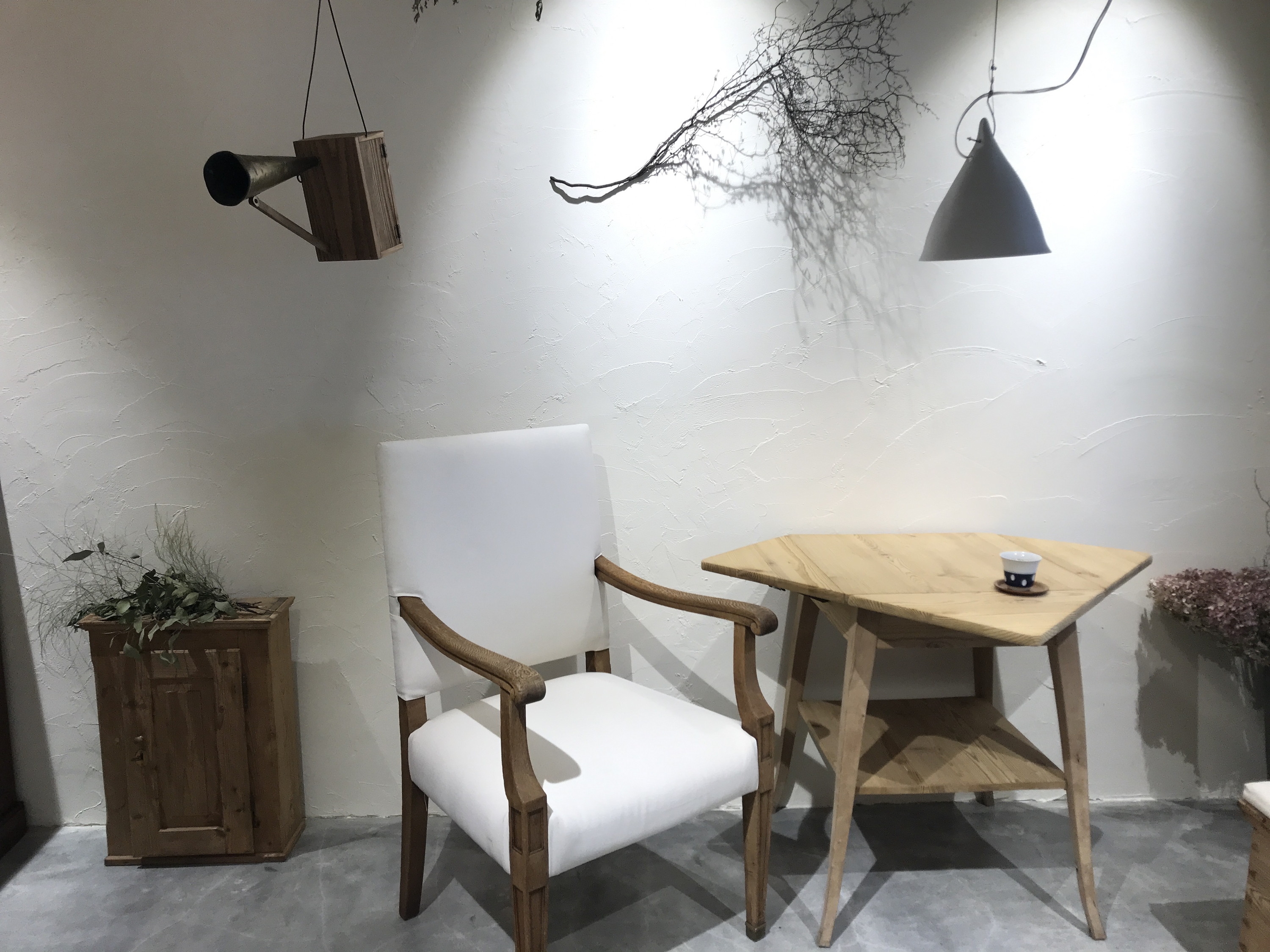 入口右側のウェイティングスペースにはドイツやオランダのアンティーク家具を配し、壁は内田さん自ら塗ったという白壁でくつろげる雰囲気を演出。