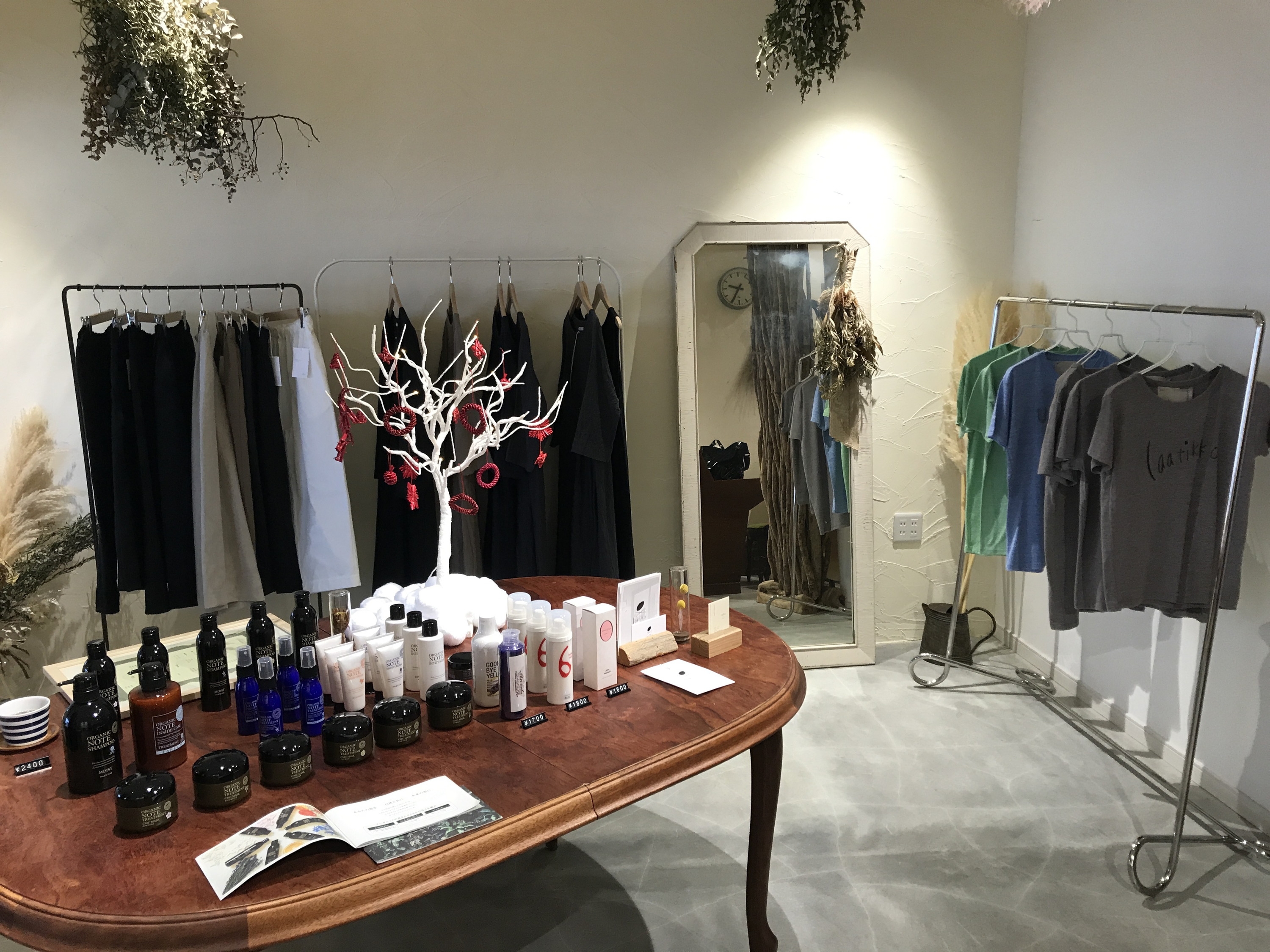 左側には天然素材の洋服がディスプレイされ、こちらはさながらブティックのよう。オリジナルのデザイン・パターンで、素材とシルエットにこだわった天然素材の洋服屋cafca(カフカ)の服を展示・販売。可愛らしさと女性らしさを兼ね備えたエイジレスな洋服として好評です。