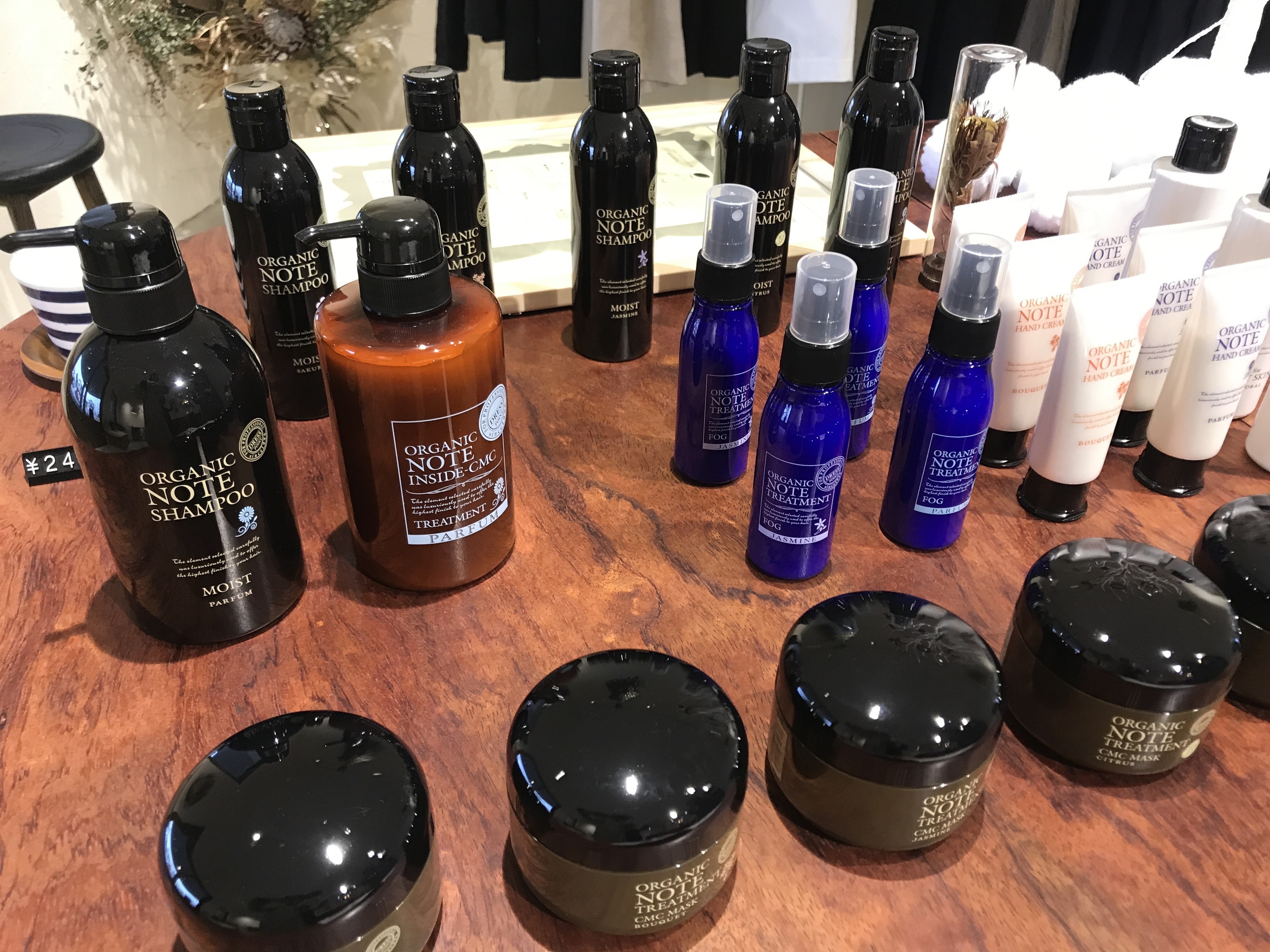 「オーガニックノート」をセレクト。美容室専売品で、体に心地よくハーブのいい匂い。大木町ではここだけの扱いです。