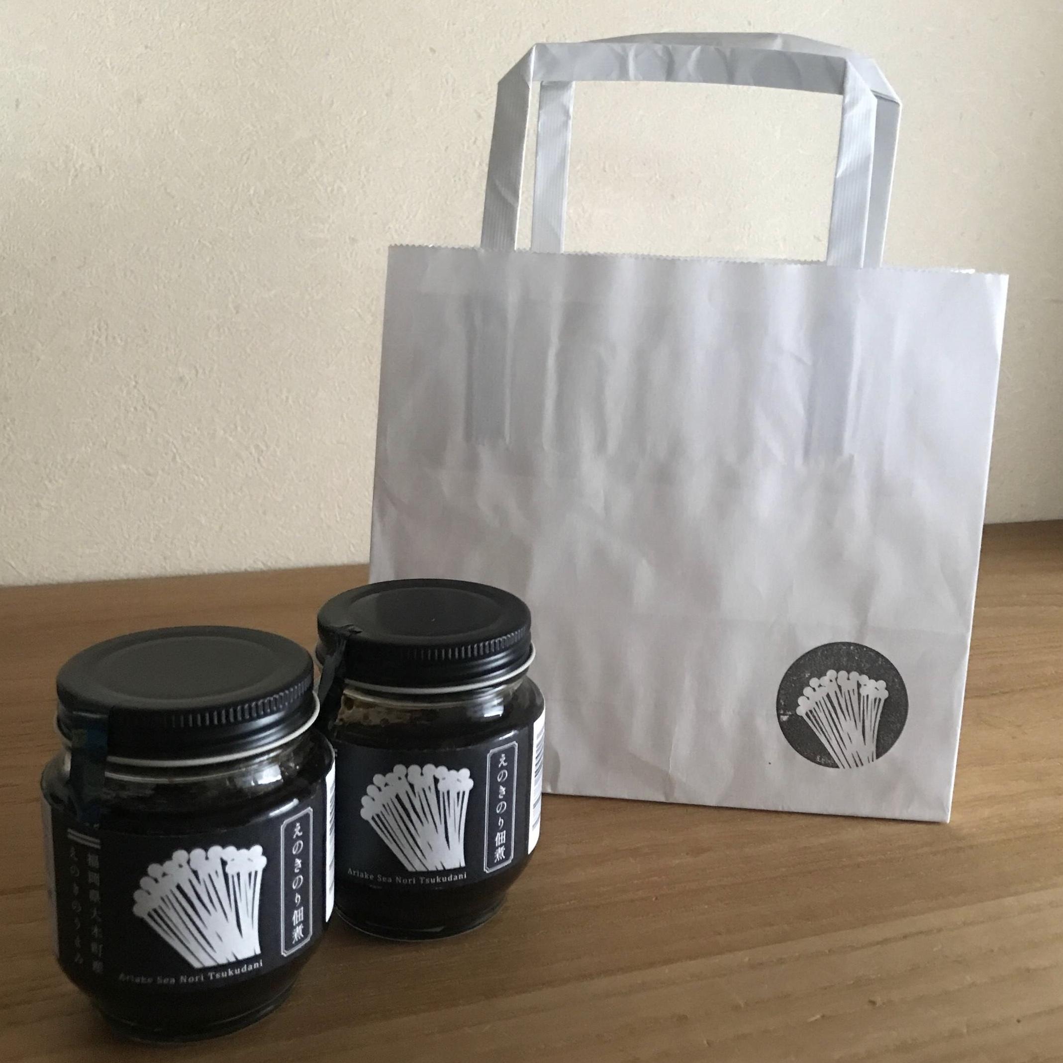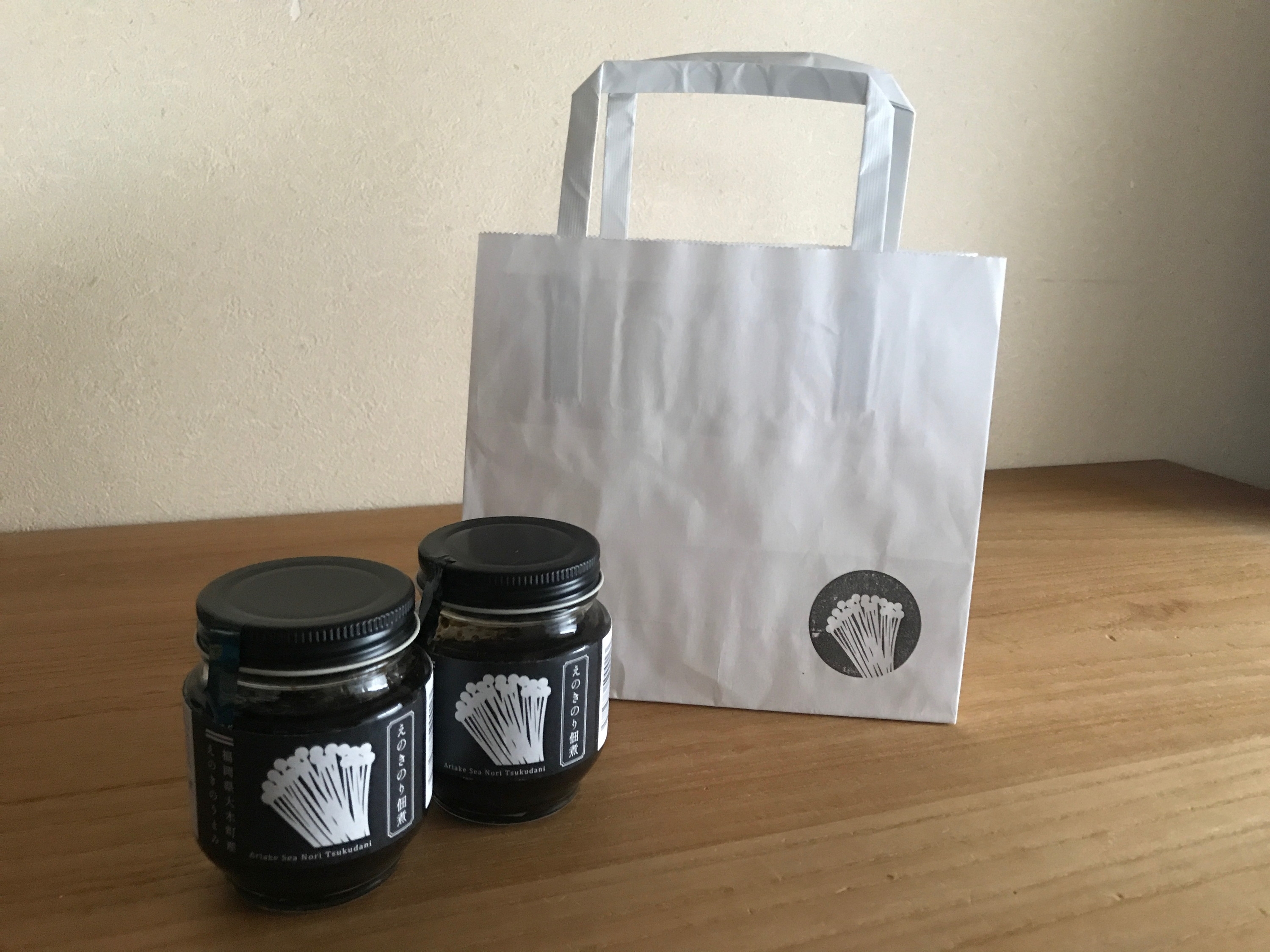 さらに、オリジナルラベルや、贈答にも気軽に利用してほしいとの思いを込めて、手作りスタンプを押した特製バッグも用意。おしゃれなのり佃煮といった佇まいで、思わず手が伸びてしまいます。