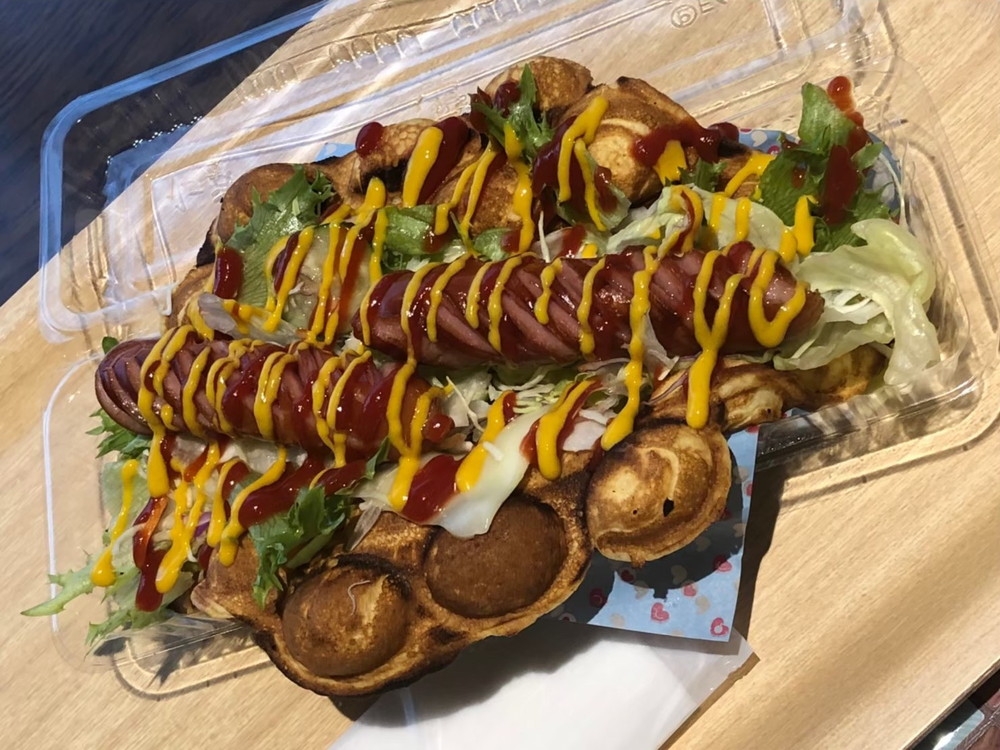 ウィンナーやベーコンがのったランチ系のワッフルもあり、こちらは男性にも人気だとか。こうしたワッフル類も、もちろんテイクアウトOKです。