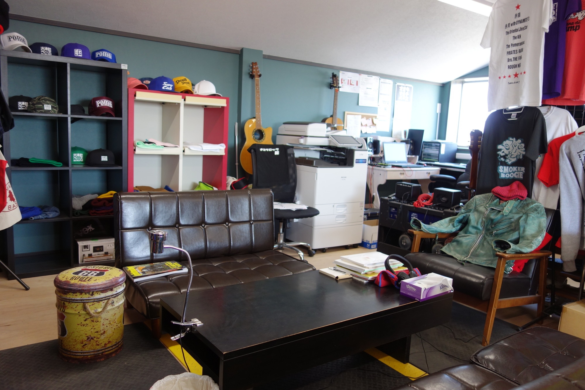 皮張りのソファを囲むように、見本用のTシャツ、バッグ、キャップなどがずらりと並び、一見ショップのようで、カフェのようでもあります。奥には作業用のデスク、プリント機材、そしてシックなグリーンの壁面にはギターがディスプレイされ、ロックが流れる室内は、さながらガレージの隠れ家といった様相です。