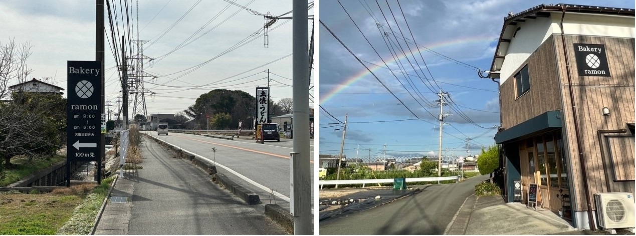 県道83号を柳川方面に向かって直進。土俵うどんの看板が見えてきたらその対面に、ベーカリーラモンの看板があります。看板を目印に細い路地を曲がり進んでいくと、住宅街の中にガラス張りのパン屋さんを発見!