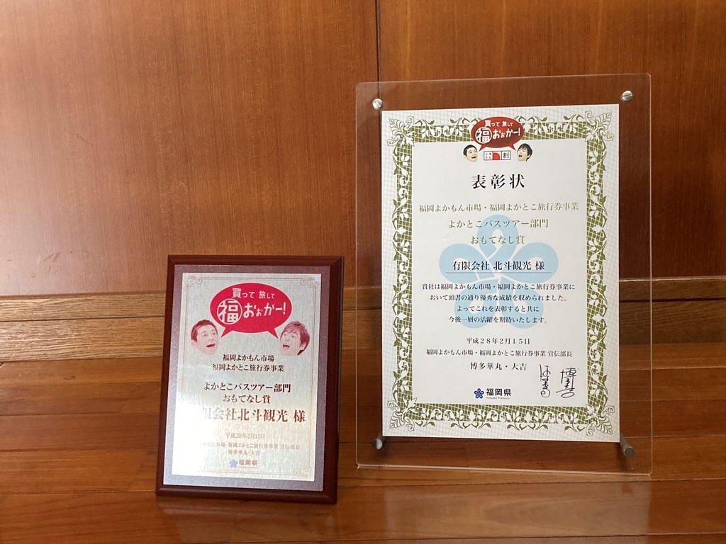 その努力と実績が評価され、平成28年には、福岡県主催で旅行参加者にアンケートを取って賞が決まる「福岡よかもん市場・福岡よかとこ旅行事業」のバスツアー部門で、参加者のアンケートにより見事「おもてなし賞」を受賞。