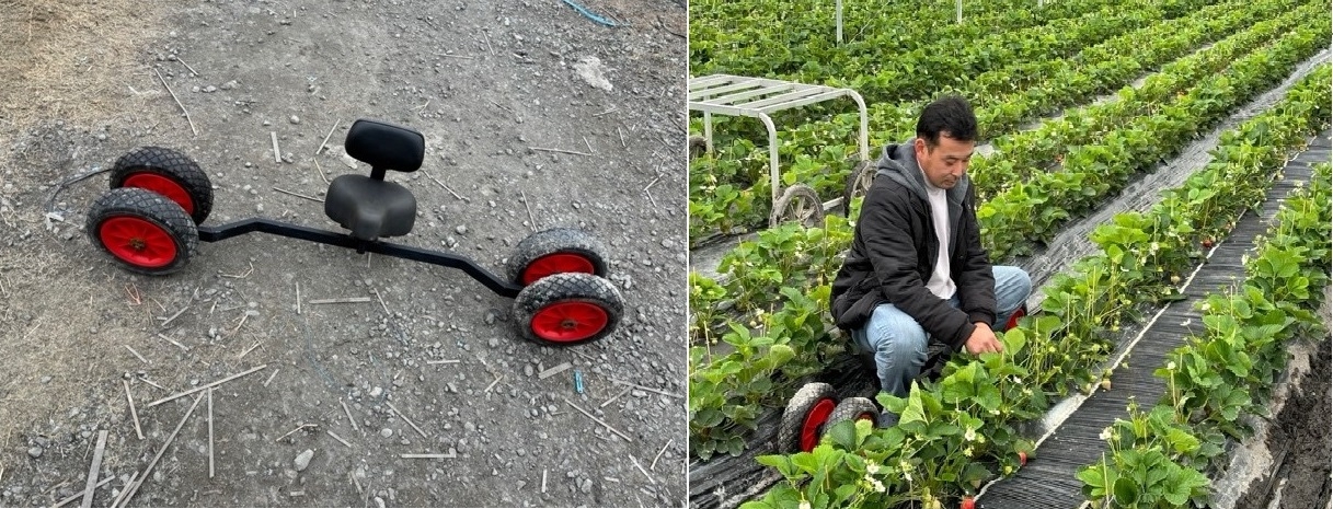 さらに、三好さんの挑戦は続きます。いちご栽培の作業が少しでも楽になるようにと、知人の鉄鋼所に依頼していちごハウス専用の「マルチ作業用イス」を独自開発したのです。
