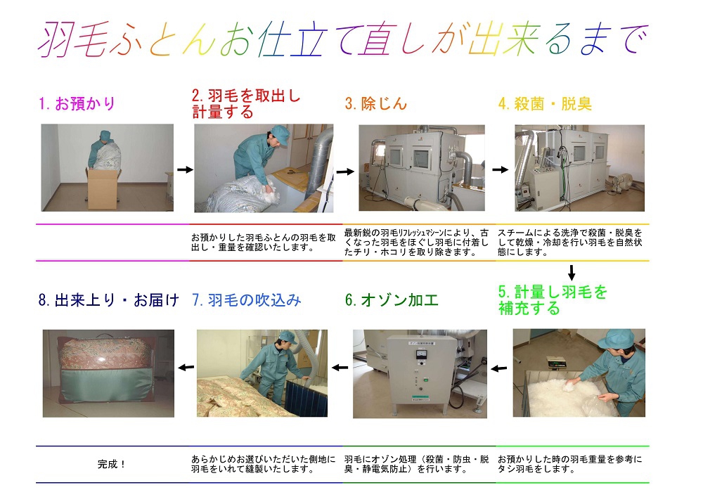 野口ふとん店では、以下の要領で羽毛布団の仕立て直しを行なっています。