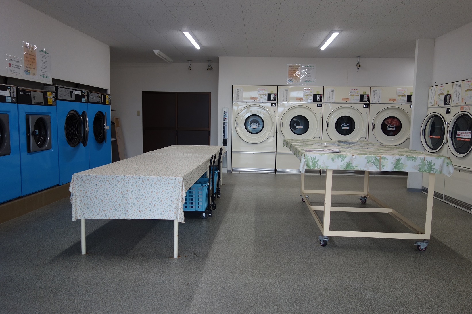 衣類はもちろんのこと、ここでは布団を丸洗いできる16kg、22kg、32kgの大型洗濯機があるのが自慢です。特に敷布団2枚やこたつ布団3枚ほどが一度に洗える32kg(1200円)は、あまりないジャンボサイズ。
