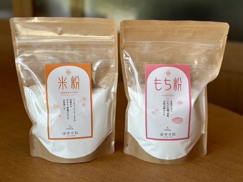人気のもち粉や、小分けのお米のパッケージも一新しました。例えば、以前はもち粉はシンプルにビニールに入った状態で販売していましたが、今はこの通り。おしゃれなデザインと、中身が見えつつ保存しやすく実用的なジッパー付きです。