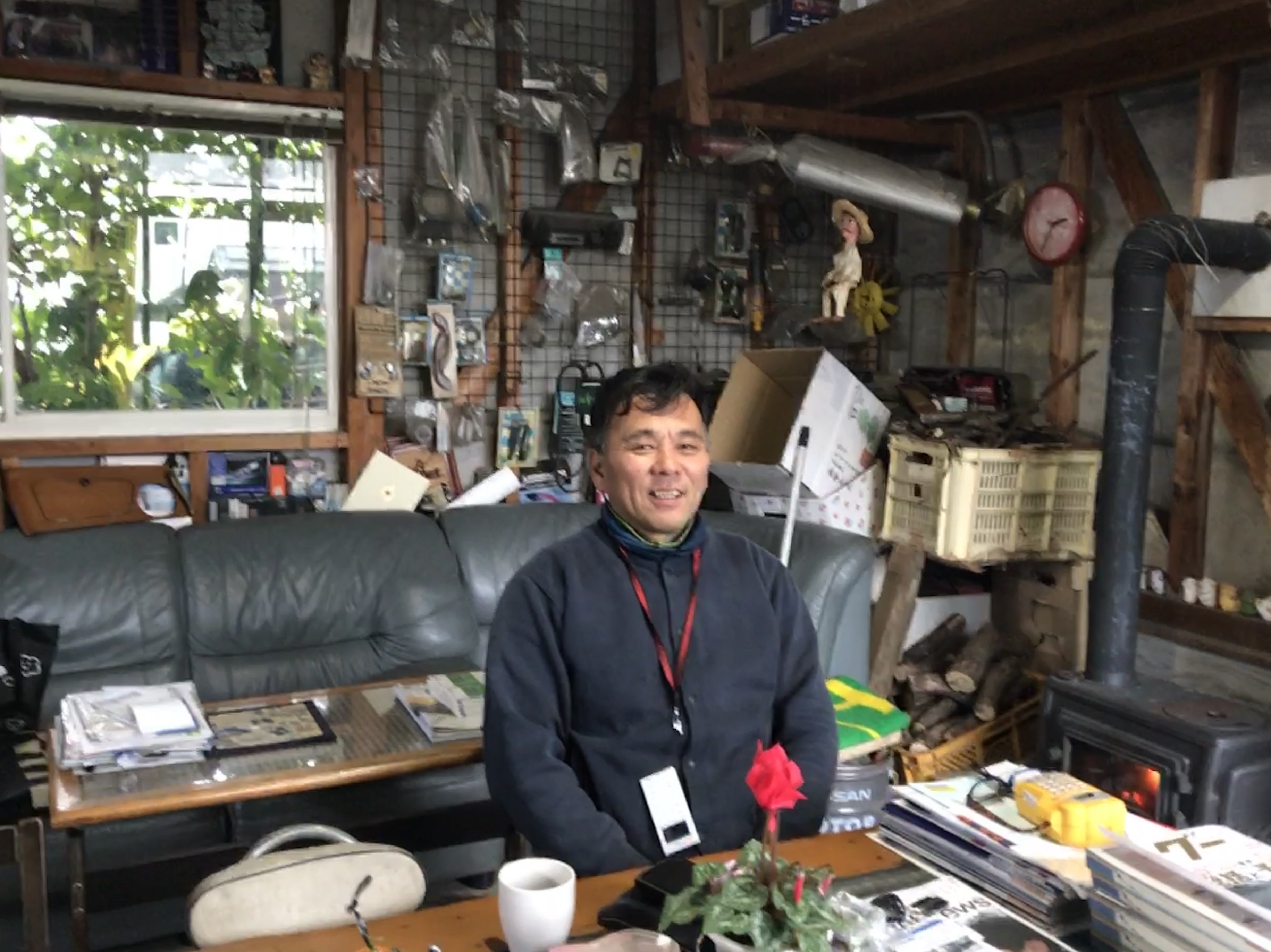 取材に訪れたのは、1月のある寒い日のこと。ログハウス風の店内は薪ストーブでふんわりと温かく、80年代の外国ミュージックがBGMに流れています。中央に大きな木製のテーブルと椅子、中2階に至る階段の先は、オーナーのパソコンや様々なグッズがひしめく秘密基地。壁面には車の部品やハンドルがディスプレイされ、随所にインドやネパールで購入した工芸品がオブジェのように配されており、さながらクルマ好き男子の趣味が形になった部屋のよう。